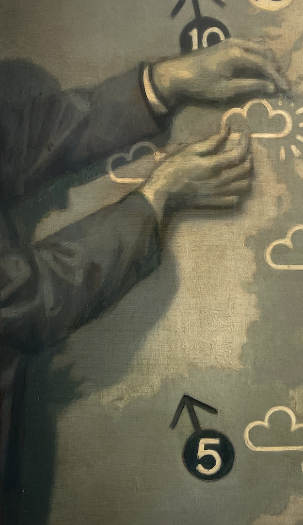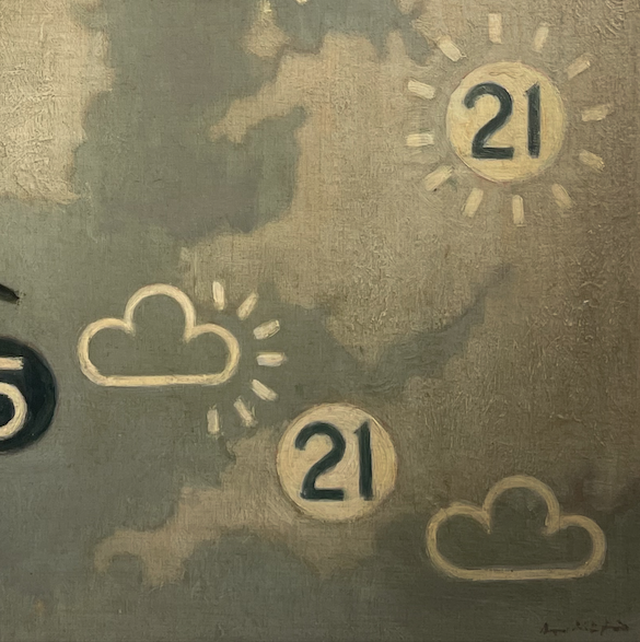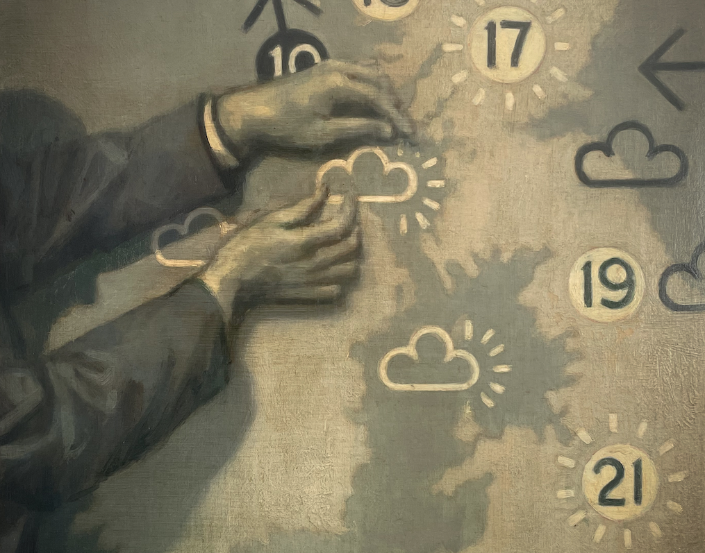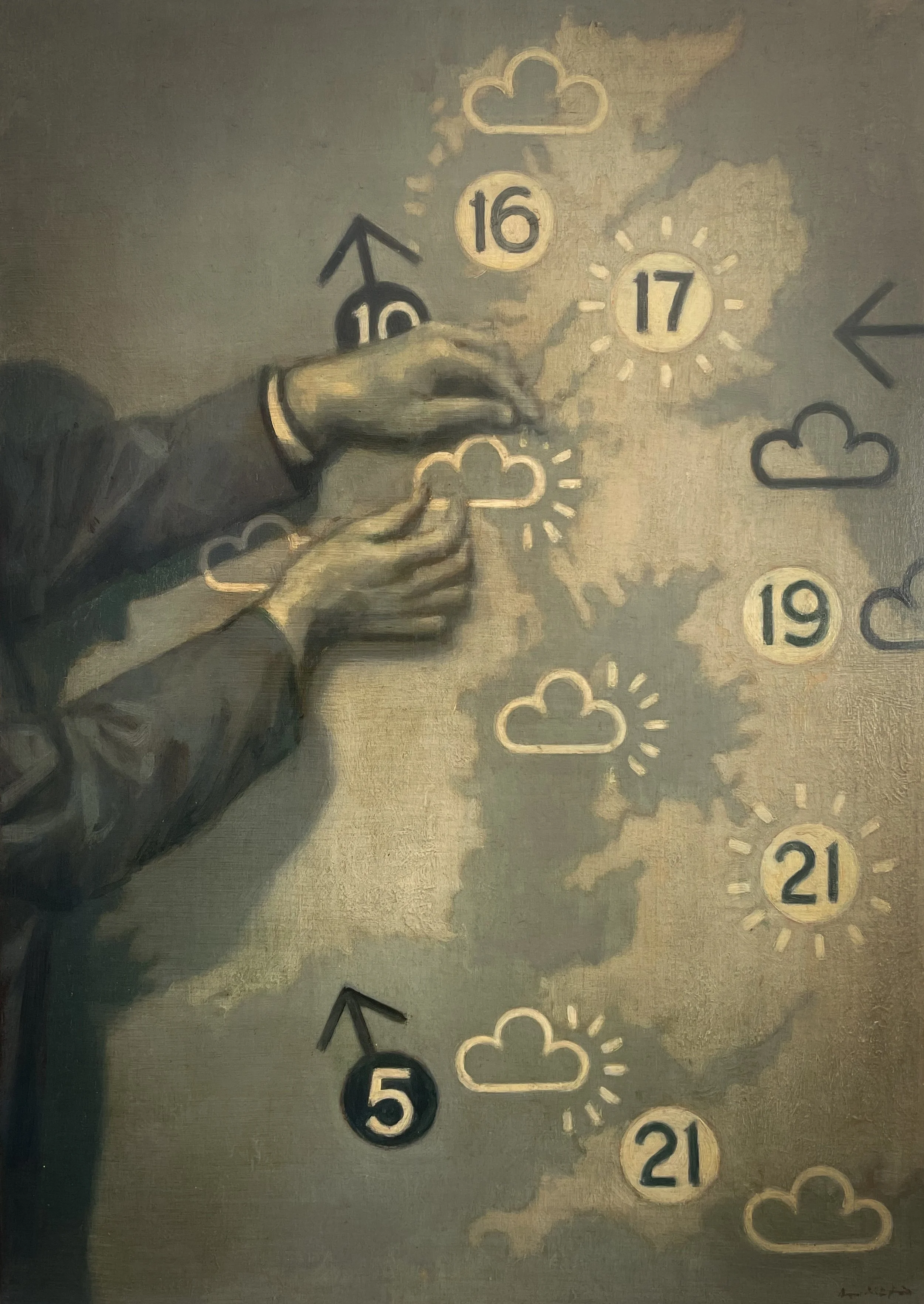 “A strong memory of growing up, this depicts an old style weather forecast. Every country is interested in the coming weather; the variability of the UK’s is almost a source of entertainment. The ‘weatherman’ (all meteorologists seemed to be men back then) is providing potentially vital information, but it feels performative, like he is making shadow puppets. It is also slightly reminiscent of ‘Nosferatu’ which undercuts the nostalgia. Not a bad day though.”